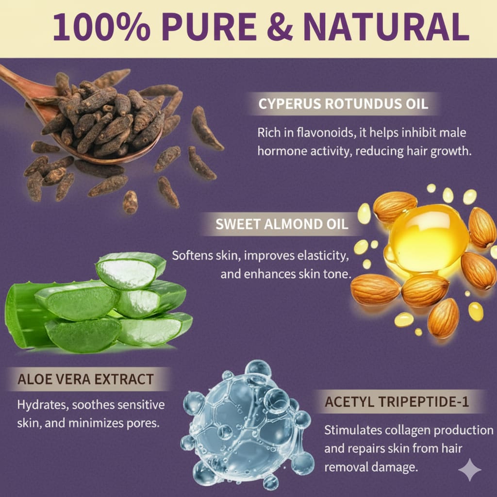 - Cyperus Rotundus oil is traditionally believed to slow down or reduce hair regrowth over time, unlike shaving which requires frequent upkeep.